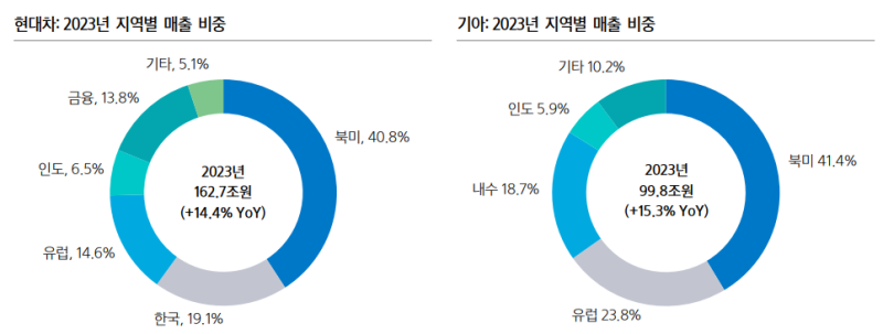 또한 현대차와 기아의 지난해 미국향 수출 대수는 각각 58만1000대, 42만1000대로 글로벌 판매량 가운데 13.8%, 13.7%의 비중을 기록했다.