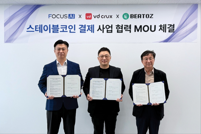 포커스에이아이는 블록체인 기반의 스테이블코인 결제 솔루션 개발을 위해 브이디크럭스·비토즈와 3자 업무협약(MOU)을 체결했다고 16일 밝혔다.