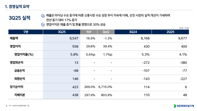 • 신기종 판매: 4월 바우마에서 공개한 36톤·40톤급 차세대 장비가 8월부터 본격 판매되며 성장에 기여