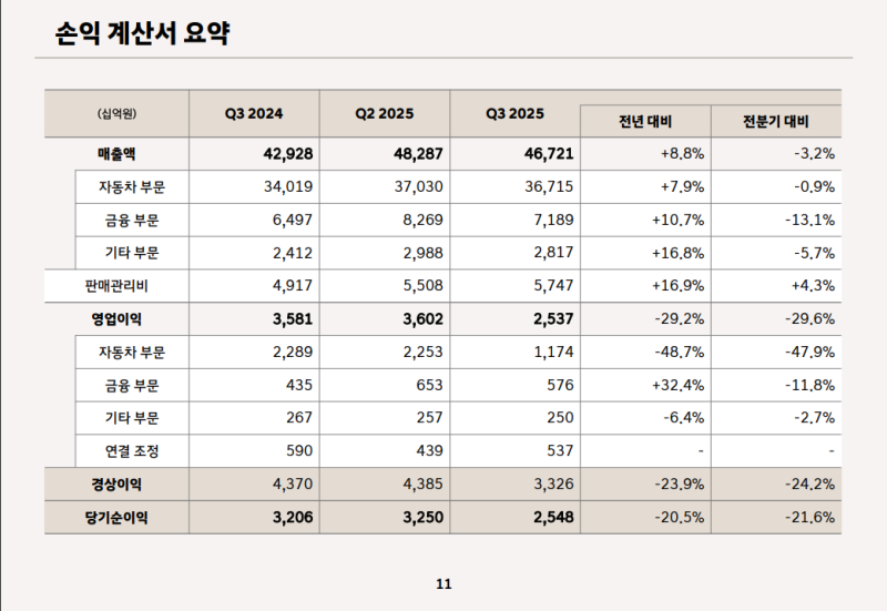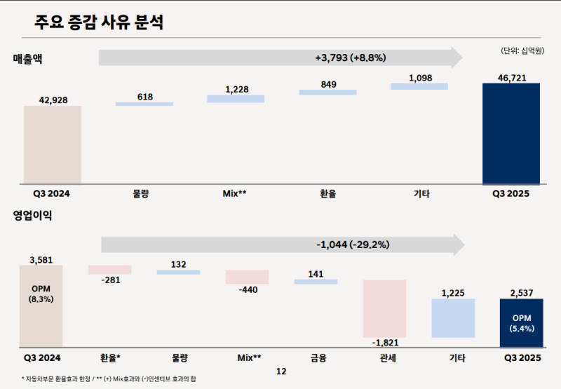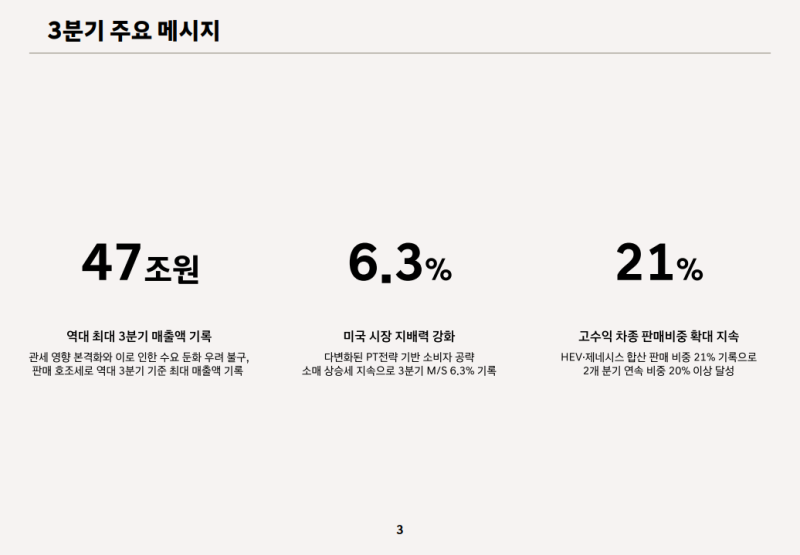 • 관세 영향 본격화에도 불구하고 판매 호조세를 유지하며 역대 3분기 기준 최대 매출액 47조원 기록