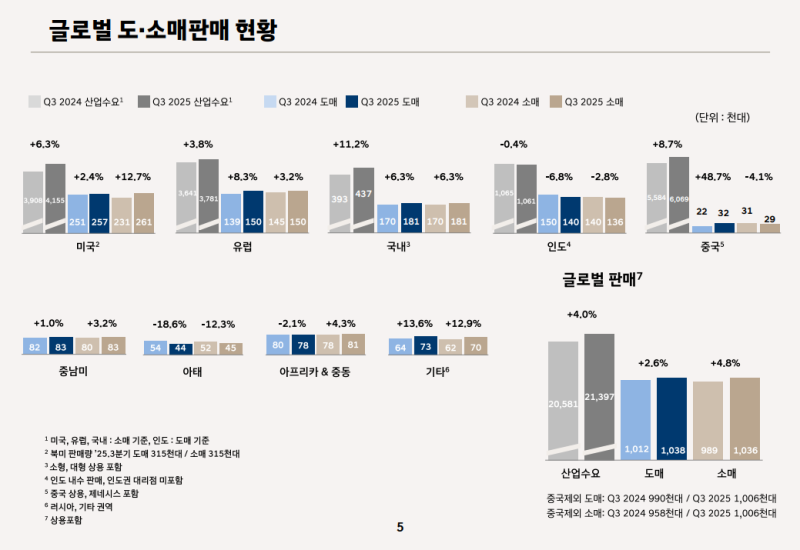 • 2025년 3분기 글로벌 도매 판매량은 103만 8천 대로 전년 대비 2.6% 증가