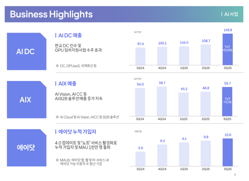 • AI DC 매출은 판교 데이터센터 인수 및 GPU 임차지원사업 수주 효과로 전년 동기 대비 53.8% 증가한 1,498억 원 기록