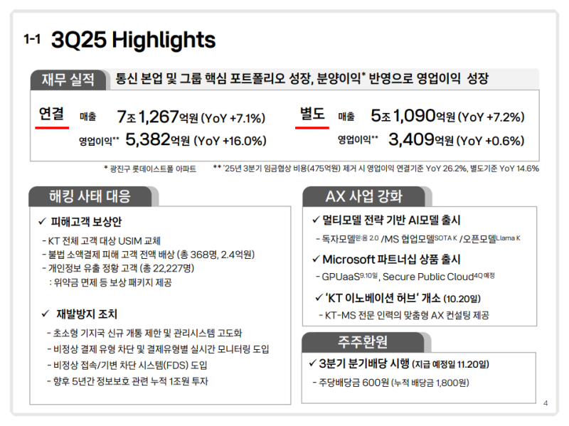 • 3분기 배당금 주당 600원으로 전년 대비 +20% 상향, 연간 배당 안정성 유지
