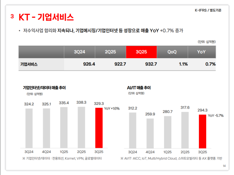 • AI·IT 사업은 AICC 대형 고객사 수주가 지속되었으나, 선택과 집중 전략에 따른 일부 사업 구조 개선 영향으로 전년 동기 대비 5.7% 감소