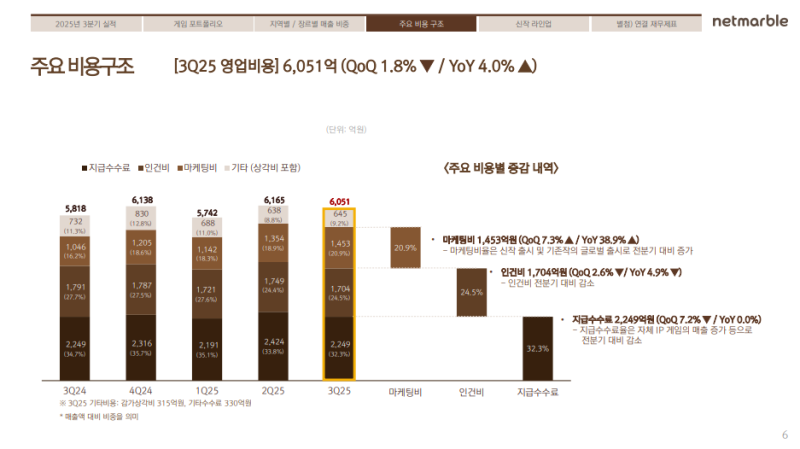 • 3분기 영업비용은 6,051억 원으로 전 분기 대비 1.8% 감소, 전년 동기 대비 4.0% 증가