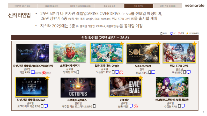 • ‘일곱 개의 대죄: Origin’과 ‘몬길: STAR DIVE’는 2026년 1분기로 출시 연기되었으나, 기존작 매출로 공백 최소화