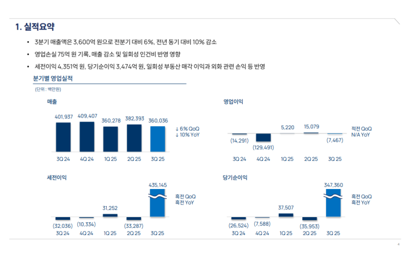 3분기 매출 3,600억 원·영업손실 75억 원(일회성 제외 시 흑자)