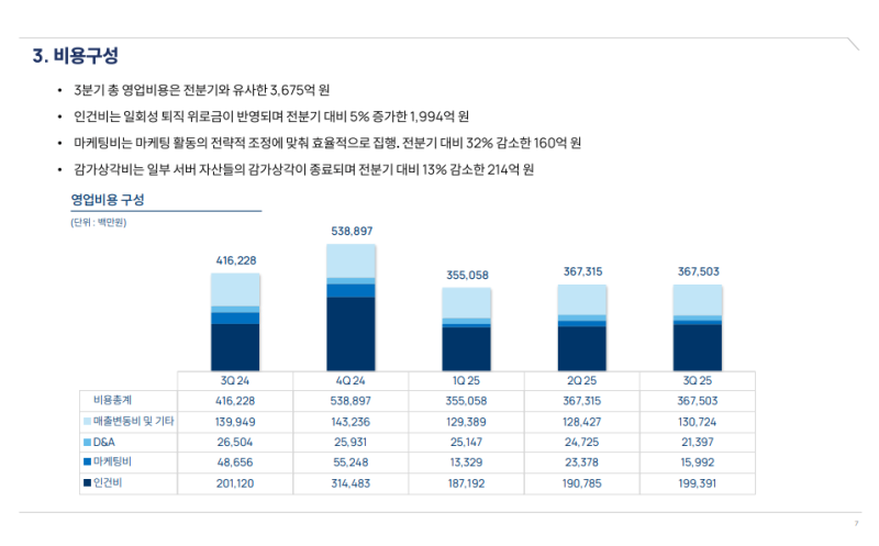 • 인건비는 전분기 대비 5% 증가한 1,994억 원으로, 일부 프로젝트 중단 및 조직 효율화에 따른 일회성 퇴직 위로금 반영