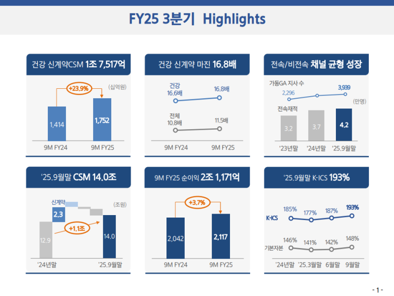 • 3Q 누적 신계약 CSM 2.3조 원, 건강·사망보장 중심으로 안정적 성장