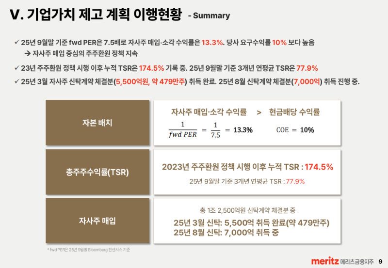 • fwd PER 7.5배 수준·TSR 174% 누적 등 밸류 부각 여지 여전