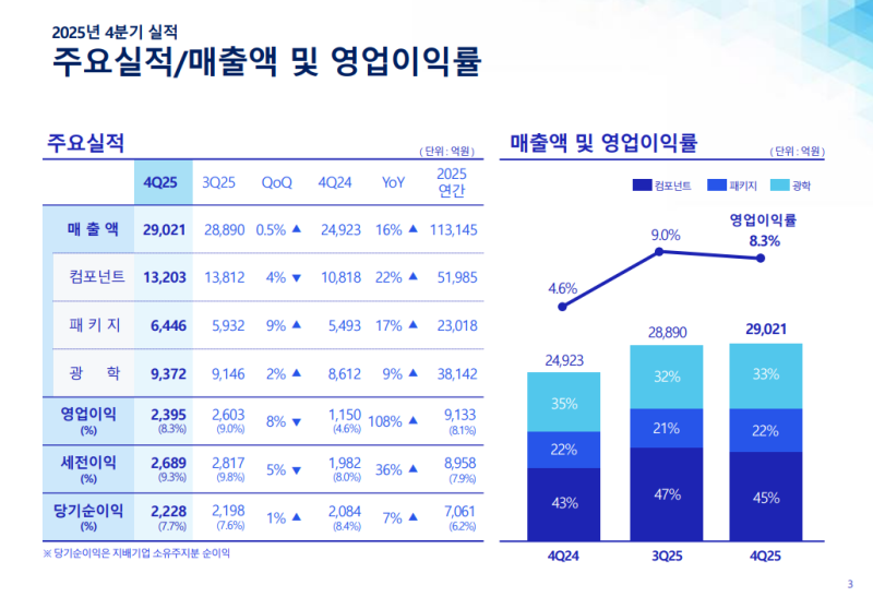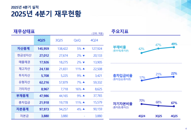 • 4Q25 전사 총매출액 2조 9021억 원 기록 (QoQ +0.5%, YoY +16%)