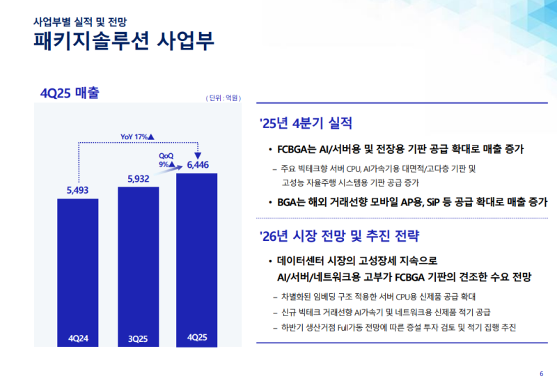 • FCBGA의 경우 주요 빅테크 거래선향 서버 CPU 및 AI 가속기용 대면적/고다층 기판 공급 확대에 따른 매출 성장