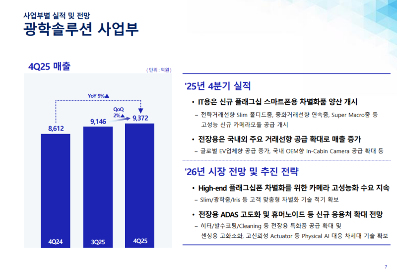 • 카메라 모듈 부문 IT/전장용 고부가 차별화 제품 공급 확대 및 휴머노이드 등 신규 분야 글로벌 협력을 통해 실적 개선 도모