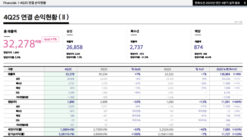 • 2025년 4분기 연결 기준 매출액 3조 2,278억 원, 영업이익 1,890억 원, 당기순이익 5,391억 원 기록