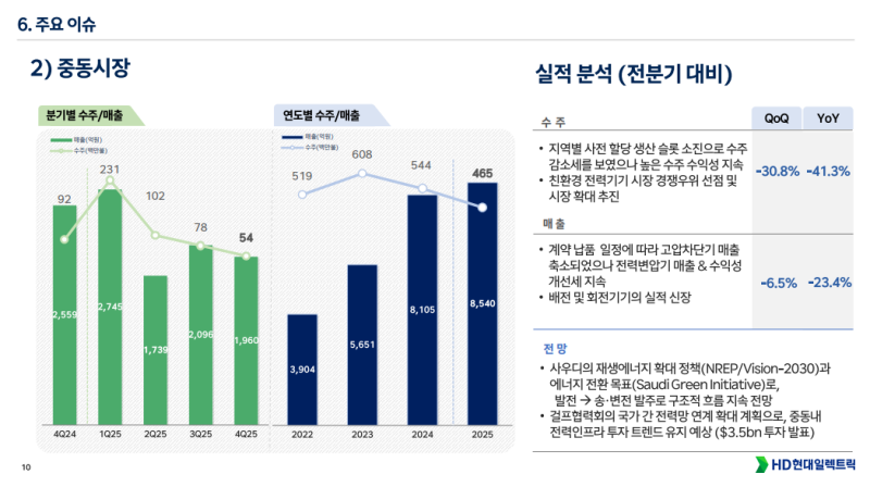 • 중동 및 유럽 지역 중심 전력변압기 매출 확대에도 불구하고 중동향 고압차단기 매출 감소 영향으로 전 분기 대비 매출 감소