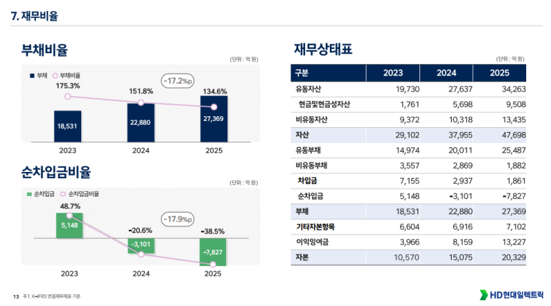 • 부채비율 130.46%, 순차입금비율 -38.5%로 순현금 기조 강화