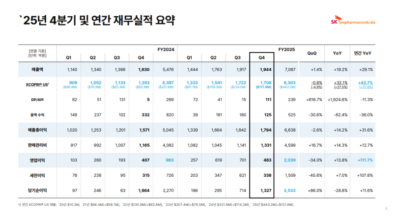 • 4Q25 XCOPRI US 매출 1,708억원($117.9M, QoQ -0.8%, YoY +32.1%), 도매상 재고 변동과 Gross-to-Net 공제율 상승, 100억원 이상 운송 중 재고 영향 반영