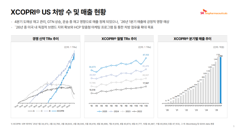 • 2026년 XCOPRI 가이던스 $550M~$580M 제시, 상단 기준 전년 대비 약 $140M 증가 목표