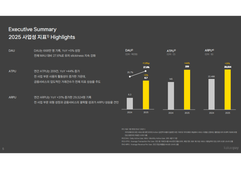 • 2025년 말 기준 DAU 668만 명 (YoY +5%), MAU 대비 비율 27.6%로 4Q24 25.7% 대비 1.8%p 상승, 서비스 교차 이용 확대 및 방문 빈도 증가에 따른 스티키니스 강화