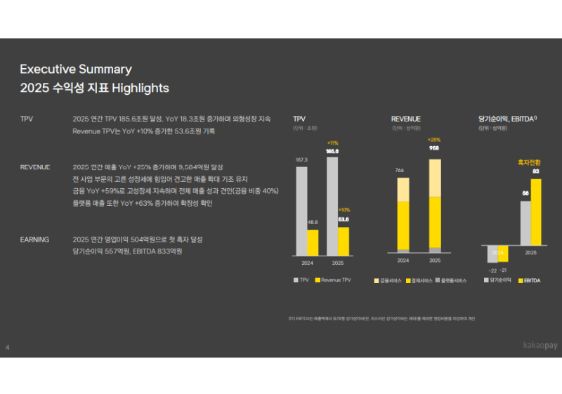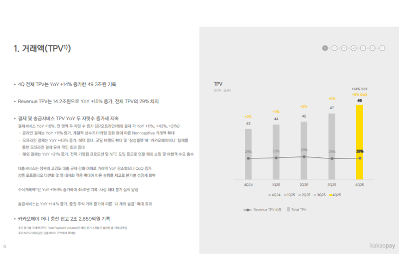 • 4Q25 전체 TPV: 49.3조 원 (YoY +14%), Revenue TPV 14.2조 원 (YoY +15%)로 전체 TPV 대비 비중 29% 기록