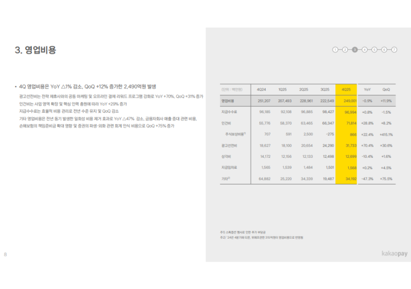• 4Q25 영업비용: 2,490억 원 (YoY -1%, QoQ +12%)