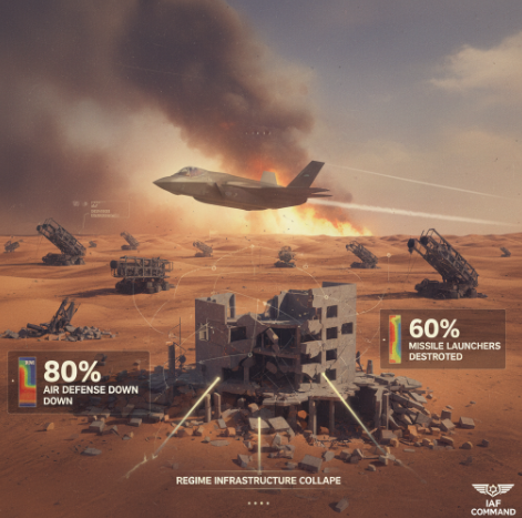 이스라엘군이 이란 내 핵심 군사 시설을 집중 타격해 방공망 80% 이상과 미사일 발사대 60%를 파괴했다고 발표했다.