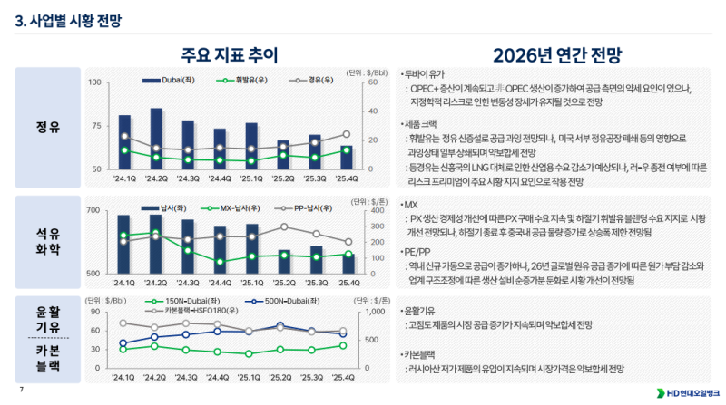 • 정유 부문은 OPEC+ 증산과 OPEC 생산 확대 영향으로 유가 약세 압력 존재하나 지정학적 리스크 영향으로 변동성 장세 전망