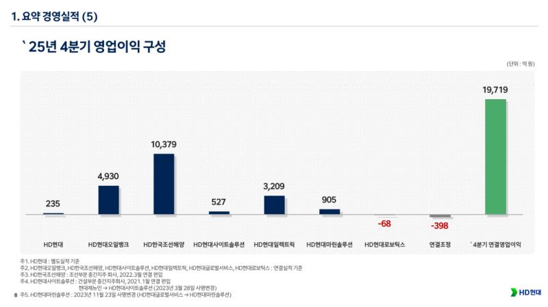• HD현대 4Q25 영업이익 1조9,719억 원 기록 (QoQ +15.8%, YoY +124.5%)하며 조선·정유·전력기기 전반 실적 개선 확인
