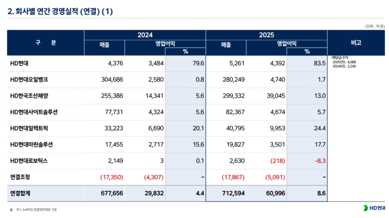 • HD한국조선해양 연결 매출 8조 1,516억 원, 영업이익 1조 379억 원 기록, 영업이익률 12.7%