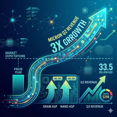 마이크론은 마이크론 2026 회계연도 3분기 실적 가이던스로 매출액 335억달러(약 49조9000억원, 오차범위 ±7억5000만달러)를 제시했다. 해당 분기의 예상 매출총이익률은 약 81%, 조정 주당순이익은 19.15달러로 전망됐다. 이와 함께 인공지능(AI) 관련 반도체 수요에 대응하기 위해 연간 자본지출(Capex) 규모를 250억달러(약 37조2000억원) 이상으로 책정했다.