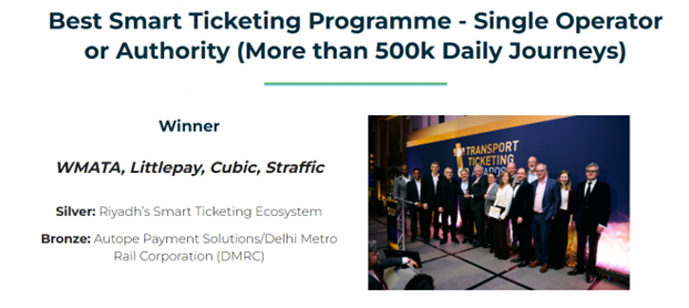 에스트래픽은 워싱턴 메트로(WMATA), 리틀페이(Littlepay), 큐빅(Cubic)과 이 상을 공동 수상했다.